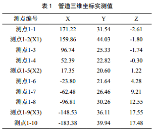 為確定管道走向,采用雷迪探測儀和全站儀相結合,實(shí)測10處災害點(diǎn)管道的三維坐標信息,相對坐標位置如表 1所示。依據測點(diǎn)坐標,由冷彎管曲率半徑40 D為基準,復現真實(shí)光滑管軸線(xiàn),并基于此建立管道有限元計算模型,如圖 7所示。