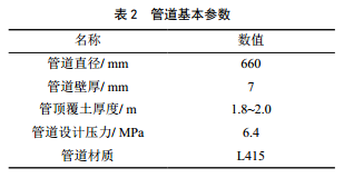 結合澀寧蘭一線(xiàn)設計資料及現場(chǎng)檢測結果,管道基本參數見(jiàn)表 2。