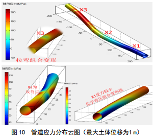 計算結果表明,當最大土體位移為1 m時(shí),管道最大軸向應力約為217 MPa,最大壓應力﹣60.7 MPa,下游段承受較大拉應力, X 3截面附近受力最不利, X2截面為反彎點(diǎn),受力狀態(tài)復雜, X1截面相對安全。
