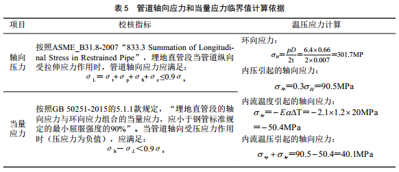 為判斷管道在土體蠕滑作用下的安全狀態(tài),需要校核管道應力。依據美國機械工程師協(xié)會(huì )ASMEB 31.8―2007和GB 50251―2015《輸氣管道工程設計規范》相關(guān)規定[5-6],分別校核管道軸向拉伸應力和軸向壓縮應力。由于管道應力不僅由季節性?xún)鐾羺^斜坡體蠕滑作用引起,同時(shí)與溫度和內壓密切相關(guān),因此在校核管道軸向應力時(shí)必須考慮內壓引起的環(huán)向應力、環(huán)向應力引起的軸向泊松應力和管體溫度改變引起的溫度應力。詳情如表 5所示。