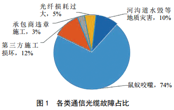 管道通信光纜與管道同溝鋪設,埋深一般在地表面下 1.0~1.5 m。通信光纜故障可分為光纜中斷、光纜斷芯和損耗過(guò)大[1]。光纜中斷故障一般是外載荷作用力導致,地表特征明顯,易于發(fā)現。光纜斷芯或光纖損耗過(guò)大等常見(jiàn)故障地表沒(méi)有明顯特征,故障點(diǎn)的查找和定位比較困難。如圖 1所示,某管道公司近3年累計發(fā)生通信光纜故障56起,其中因鼠蟻咬噬導致光纜斷芯及光纖損耗過(guò)大等光纜故障占比達79%。