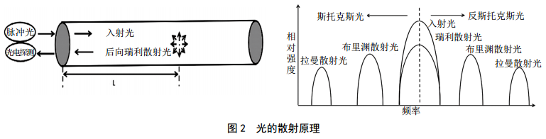 光時(shí)域反射儀(Optical Time Domain Reflectometer, OTDR)是當前通信光纜維護最常用、最便捷的工具。它是基于光在光纖中傳輸過(guò)程中的后向瑞利散射和菲涅爾反射原理。如圖 2所示。激光器發(fā)出的光在光纖傳播過(guò)程中,受光纖材質(zhì)不均勻性影響,光子與纖芯晶格間發(fā)生碰撞會(huì )產(chǎn)生散射效應。包括瑞利散射、拉曼散射、布里淵散射。當光纖鏈路中有非常規能量損失點(diǎn)時(shí),后向瑞利散射光特性會(huì )發(fā)生明顯變化,通過(guò)檢測后向散射光能量的大小用以定位傳輸衰減故障點(diǎn)。當光纖鏈路中有斷點(diǎn)時(shí),光會(huì )在斷點(diǎn)處產(chǎn)生菲涅爾反射,通過(guò)檢測光信號即可定位光纖斷點(diǎn)位置。