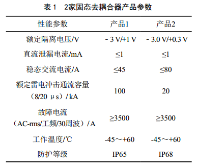 固態(tài)去耦合器主要由電容、二極管(或者晶閘管)以及浪涌保護裝置并聯(lián)組成。其中電容元件用來(lái)導通交流電流;二極管(或者晶閘管)用于控制固態(tài)去耦合器兩端的直流電壓差,在二極管(或者晶閘管)的閾值范圍內,直流不導通,在兩端電壓差超過(guò)閾值范圍后,二極管(或者晶閘管)導通;浪涌保護裝置用于導通故障電流或者雷擊電流,防止電容和二極管(晶閘管)受故障或者雷擊電流的影響。不同廠(chǎng)家固態(tài)去耦合器的參數如表 1所示,其中額定隔離電壓指固態(tài)去耦合器兩端電壓差。在此范圍內,導通的直流電流小于規定的1 mA。如額定隔離電壓為﹣3 V/+1 V,表示兩端的電壓差在﹣3 V~+1 V范圍內,導通的直流電流小于1 mA;兩端電壓差小于﹣3 V和大于+1 V時(shí),導通的直流電流大于1 mA。