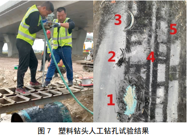 塑 料 鉆 頭 、 X Y- 1 型 鉆 機 在 管 道 上 方 以 自 重(60~70 kg)和液壓(3 t)兩種形式鉆孔。試驗結果: