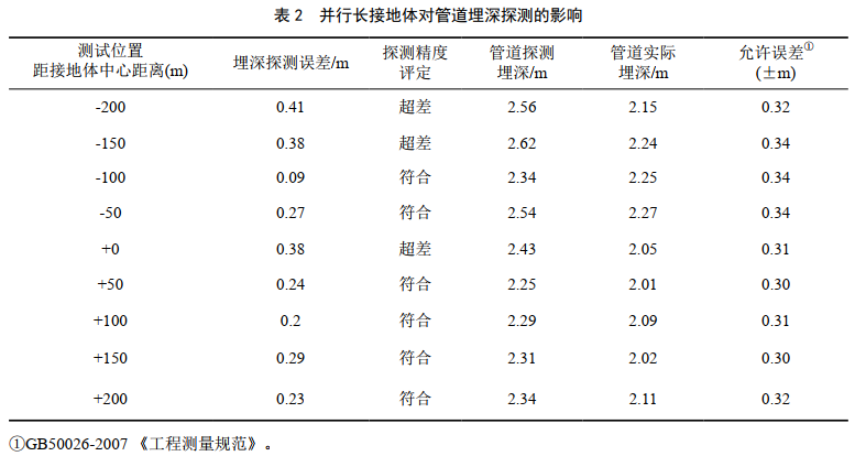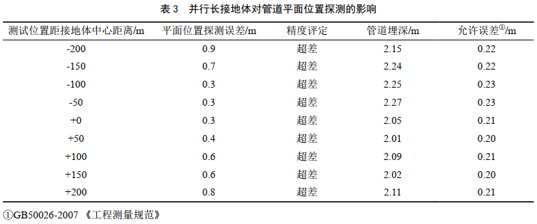 當長(cháng)排流接地體與管道近距離(國內典型間距5 m)并行敷設時(shí),交流電壓梯度檢測電流流經(jīng)管道時(shí),會(huì )在排流接地體上產(chǎn)生感應電流,這個(gè)交變的感應電流在接地體周?chē)纬啥胃袘艌?chǎng),由于接地體的電磁場(chǎng)與管道上檢測電流形成的電磁場(chǎng)頻率相同,加上兩個(gè)磁場(chǎng)距離很近,將互相疊加、干擾,導致管道上的磁場(chǎng)形狀發(fā)生變化。管道定位、測深技術(shù)是基于檢測管道上的電磁場(chǎng)強度和位置,因而在管道附近有長(cháng)的并行接地體時(shí),探測到的管道埋深和位置會(huì )存在偏差,并且是不可接受的,詳見(jiàn)表 2、表 3。