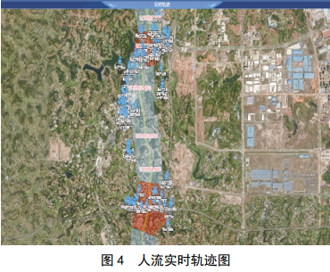 系統利用LBS數據倉庫,建立LBS數據模型,統計分析油氣管道監視區域內活動(dòng)人員流量及活動(dòng)人員的行為特征,估算出人員流量情況、人員出現時(shí)間、滯留時(shí)間,距管道距離等,為油氣管道周界內的安保工作提供指引。通過(guò)統計分析LBS位置大數據,并在地理信息系統(GIS)上以直觀(guān)、可視化的色度表達形式(“熱力圖”)展示監視區域內的人流量估值、人流量密度、人流分布、人流實(shí)時(shí)軌跡及軌跡回放等信息(圖 2、圖 3、圖 4)。