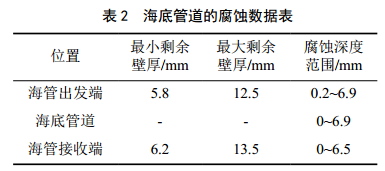 2013年10月對該海管進(jìn)行內檢測通球發(fā)現,海管內積存大量泥垢,內部腐蝕、結垢嚴重。內檢測結果顯示存在多處腐蝕缺陷,計算壁厚損失超過(guò)初步報告臨界值。通過(guò)對海管2處凹坑較嚴重部位所對應的外表面進(jìn)行壁厚檢測,測得最小壁厚值1#檢測點(diǎn)為6.8 mm, 2#檢測點(diǎn)為5.8 mm。抽查檢測管線(xiàn)其他位置壁厚, 1#抽查段為7.5~10.0 mm; 2#抽查段為11.8~12.5 mm,最大壁厚值為12.5 mm。另外抽檢海管接收端法蘭以上壁厚,最小壁厚為6.2 mm,最大壁厚為13.5 mm。海底管道的腐蝕情況如表 2所示。