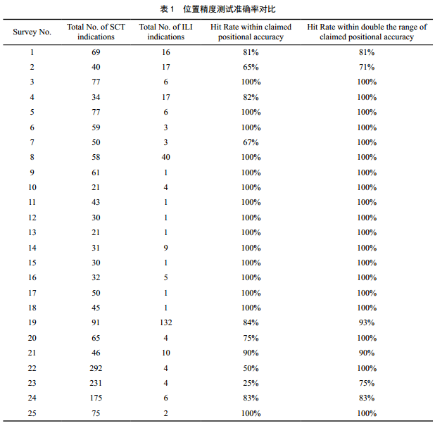 針對內檢測結果,對SCT報告的25個(gè)結果進(jìn)行了對比研究。 如果內檢測報告在SCZ一定范圍內有一個(gè)缺陷,則計算為一個(gè)準確檢測點(diǎn)。 SCZ的位置精度為±1 m(表 1)。