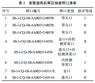通過(guò)竣工資料,收集高后果區內焊口清單和施工記錄,鑒于環(huán)焊縫失效事故發(fā)生在連頭口、金口、 變壁厚焊口、返修焊口上的比例很高,因此按此順序優(yōu)先抽查高后果區內的上述焊口,形成抽查焊口清單(表 2)。