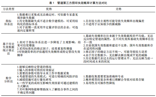 以上三種方法均在一定程度上解決了實(shí)際問(wèn)題,指標體系法簡(jiǎn)單易用但受主觀(guān)影響較大;跉v史數據統計修正法,易用性及復雜程度居中,得到了廣泛認可,但修正因子方法的確定不統一限制了進(jìn)一步發(fā)展。數學(xué)分析法能夠解決不同失效模式的失效問(wèn)題,能應用于更精確的風(fēng)險評估,但模型復雜難以理解,可操作性低。三種方法的對比及優(yōu)缺點(diǎn)如表1所示。