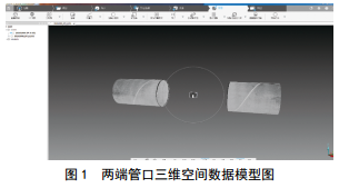 三維激光掃描技術(shù)又稱(chēng)“實(shí)景復制技術(shù)”,即通過(guò)對物體空間外形和輪廓進(jìn)行激光掃描,快速、大范圍采集得到物體表面的點(diǎn)云數據(即空間三維坐標數據),并利用相關(guān)軟件建立物體的實(shí)景三維模型[4]。采用激光測量,以主動(dòng)非接觸方式快速獲取目標表面的三維空間坐標數據,反映目標實(shí)時(shí)現狀;數據量大,點(diǎn)位精度高[5]。用FARO高速三維激光掃描儀掃描換管作業(yè)兩端管口,基于相位偏移技術(shù),掃描儀持續向外投射不同波長(cháng)的紅外光,接觸到對象后反射回到掃描儀,通過(guò)測量紅外線(xiàn)光波的相位偏移,即可準確判斷掃描儀到對象的距離。使用角度編碼器測量FARO激光掃描儀的鏡像旋轉和水平旋轉,計算各點(diǎn)的X、 Y、 Z坐標。用掃描儀SCENE軟件過(guò)濾處理兩端管口的三維空間數據模型見(jiàn)圖 1。