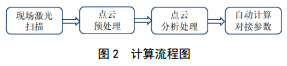 計算流程見(jiàn)圖 2,計算步驟包括:①現場(chǎng)激光掃描管道,獲取管道及管口點(diǎn)云數據;②利用SCENE 軟件對點(diǎn)云數據進(jìn)行預處理,包括濾波、剪裁;③計算軟件對預處理后的點(diǎn)云數據進(jìn)行處理分析,特征識別,優(yōu)化擬合;④獲取管道及管口下料參數數據。