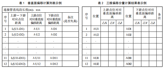 大口徑管道直管段更換作業(yè)計算過(guò)程示意見(jiàn)圖 3,定義兩個(gè)端面分別為上游端面(U)和下游端面(D),從端面的最高點(diǎn)起,按順時(shí)針?lè )较驅A周等分為12份,對應的點(diǎn)位分別為U1、 U2、 U3…U12和D1、 D2、 D3…D12。 軟件自動(dòng)計算各位置的距離和偏移量,以表1形式展示。三維坐標軸上的各個(gè)偏移分量計算結果如表 2示例。