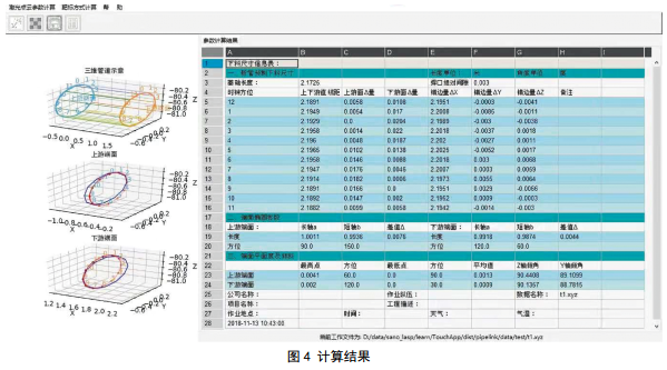 現場(chǎng)掃描耗時(shí)2分30秒,掃描完成后, SCENE軟件對數據預處理,用時(shí)6分30秒。計算軟件讀取掃描數據后,一鍵完成分析、提取、計算、建模和展示,自動(dòng)采點(diǎn)測量建模和數據處理用時(shí)2分鐘,計算結果見(jiàn)圖 4。完成以上各步驟總時(shí)長(cháng)為14分鐘,相比人工測量計算縮短了大量時(shí)間。