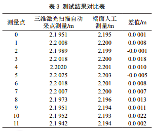 隨后組織 經(jīng) 驗 豐 富 的 管 工 、 焊 工 和 技 術(shù) 員 人工實(shí)測,測量結果對比見(jiàn)表 3?梢钥 出 , 三 維激 光 掃 描 自 動(dòng) 采 集 測 量 計 算 與 人 工 測 量 差值為﹢0.0 022 m~﹣0.0 005 m,最大差值為0.0 027 m,數據吻合度較高。