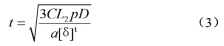 式 中S 為 卡 具 壁 厚 ( 實(shí) 際 應 用 中 不 應 小 于 6mm), mm; p 為卡具設計壓力, MPa; D 為卡具直徑(注劑式卡具為管道本體外徑+2倍注劑厚度),mm; φ 卡具接頭系數; pL為泄漏介質(zhì)最高壓力,MPa; [δ]t為卡具材料的許用應力(泄漏介質(zhì)溫度下), MPa。