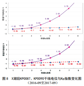 由于站場(chǎng)、閥室臨近陰極保護通電點(diǎn),所以其管地電位波動(dòng)幅度有所減弱,干線(xiàn)的管地電位正偏或者負偏幅度要更大。以某輸氣管道KP0087、 KP0090為例,當Kp指數為8時(shí),前者最正通電電位和斷電電位分別達到﹢5.92 V、﹣ 0.4 V;后者分別為﹢4.88 V、﹣0.54 V;此時(shí)處于明顯的欠保護狀態(tài),如圖 8所示。