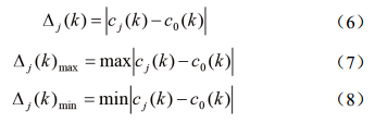 選取參考數列,記為C0(k ),其他數列與之比較,得到絕差數列∆j(k),并求出∆j(k) max和∆j(k) min,分別表示如下: