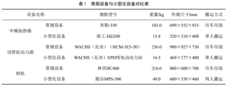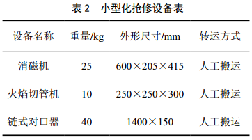 在保證搶修機具設備功能正常、滿(mǎn)足作業(yè)要求的前提下,將其小型化、輕量化、便捷化,替代原常規設備,可高效快捷完成裝車(chē)和山區進(jìn)場(chǎng),以確保在有限時(shí)間內完成搶修作業(yè)。常規設備與小型化設備對比見(jiàn)表 1。選型之初即已滿(mǎn)足小型化要求的設備見(jiàn)表 2。