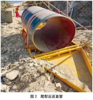 (1)爬犁運輸系統架設。先行在山頂和山腳分別安裝卷?yè)P機(絞車(chē)),并與地錨連接固定,然后將爬犁的兩端分別與兩臺卷?yè)P機連接。爬犁行走路徑需選擇盡量平整的坡面,但仍不可避免在橫向上遇到大角度側坡,為避免運送爬犁發(fā)生大位移的側滑,需使用輔助導向索。經(jīng)試驗,此系統能夠成功運送直徑1 219 mm、長(cháng)2 m的管道短節至坡面作業(yè)點(diǎn),見(jiàn)圖 3。另外,山區道路坡度較大,采用此爬犁系統運送小型化搶修設備,可避免人工搬運,確保安全。