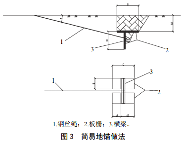 (3)地錨鋪設。地錨是固定卷?yè)P機及滑輪的關(guān)鍵裝置,根據地錨安裝土質(zhì),可分別選用巖質(zhì)地錨鋪 設方式和土質(zhì)地錨鋪設方式。