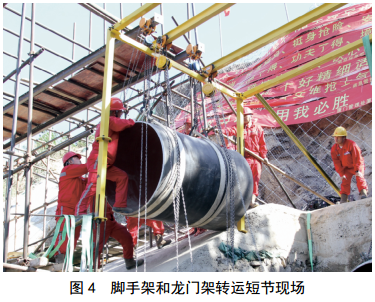 在事故點(diǎn)作業(yè)面需搭設腳手架和龍門(mén)架,進(jìn)行設備轉運及管道組對工作。在爬犁到達作業(yè)點(diǎn)最近處到作業(yè)坑之間搭設腳手架,在腳手架上搭設兩條滑道,在滑道上設置滑車(chē)及葫蘆;在作業(yè)坑上方搭設龍門(mén)架。爬犁到達預定位置后,用葫蘆吊起短節,通過(guò)滑道滑至龍門(mén)架,再通過(guò)龍門(mén)架上的滑車(chē)和葫蘆系統吊起短節,移至作業(yè)坑上方進(jìn)行組對,見(jiàn)圖 4。
