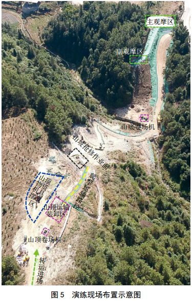 西氣東輸管道公司于2019年11月開(kāi)展了山區管道泄漏突發(fā)事件實(shí)戰演練。模擬西氣東輸三線(xiàn)干線(xiàn)福建段在泉州市洛江區虹山鄉蘇山村發(fā)生天然氣管道泄漏,泄漏點(diǎn)位于35°(局部達40°)以上坡度的石質(zhì)山坡,無(wú)預設地錨等任何輔助措施,在山坡中部設置了模擬作業(yè)坑,在山頂、山底設置地錨、卷?yè)P機,所有搶修設備、管道短節等通過(guò)小路運送至山頂,現場(chǎng)布置情況見(jiàn)圖 5。本次演練檢驗了從設備到達山頂到焊接結束的整個(gè)作業(yè)過(guò)程,用時(shí)45小時(shí),無(wú)損檢測結果合格,充分驗證了運輸系統的適用性。此進(jìn)場(chǎng)方式快捷有效,能夠保證在72小時(shí)內完成山區管道搶修作業(yè)。