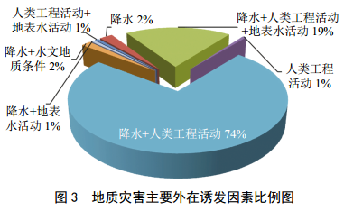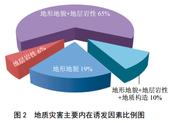 (2)地質(zhì)災害誘發(fā)因素。分為內在影響因素和外在誘發(fā)因素。通過(guò)對管道沿線(xiàn)地災隱患發(fā)育情況和地質(zhì)環(huán)境條件情況調查分析,主要內在影響因素有:地形地貌條件、地層巖性條件、地質(zhì)構造條件等;主要外部誘發(fā)因素有:降水、人類(lèi)工程活動(dòng)、水文地質(zhì)條件和地表水活動(dòng)等。地質(zhì)災害的發(fā)生多數情況下由多個(gè)內因或外因共同作用,見(jiàn)圖 2和圖 3。根據統計結果,地災隱患內在因素以地形地貌+地層巖性的組合因素最為普遍,其次受地形地貌內在因素的控制。