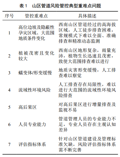 表 1為山區管道風(fēng)險管控典型重難點(diǎn)問(wèn)題。