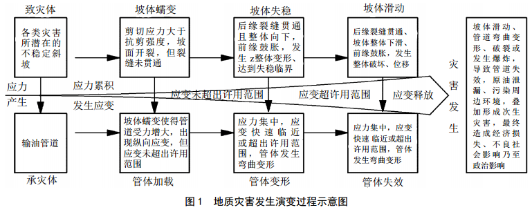 延緩發(fā)育性管道地質(zhì)災害具有明顯的“因果型災害鏈”,只要能夠掌握致災體與承災體之間的因果聯(lián)系,就有可能及時(shí)預警,提前采取治理措施。圖 1以致災體與承災體之間的關(guān)系,描述了管道地質(zhì)災害發(fā)生的演變過(guò)程。