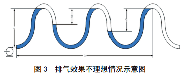 運行中管道排氣效果往往不是理想狀態(tài),經(jīng)常在管道的高點(diǎn)集氣,多重起伏的管道會(huì )在各個(gè)高點(diǎn)上形成氣袋,導致計算得出的摩擦阻力會(huì )大于理論摩擦阻力,氣體積存的越多,實(shí)際摩擦阻力越大,如圖 3和方程(2)所示。