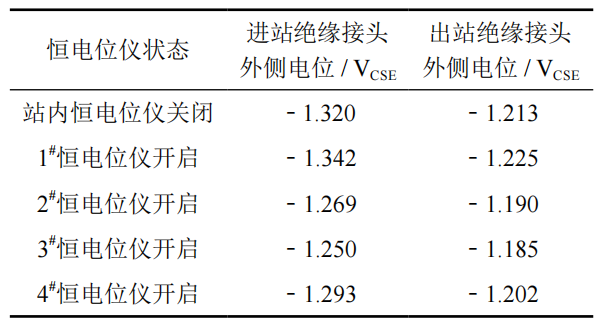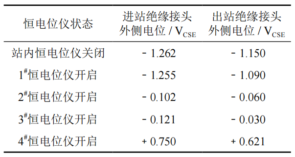 逐個(gè)開(kāi)啟站內恒電位儀,測試進(jìn)出站絕緣接頭外側電位,分析治理措施實(shí)施后區域陰極保護系統對站外管道的雜散電流干擾情況,測試結果見(jiàn)表 4。在開(kāi)啟站內4路恒電位儀時(shí),進(jìn)出站管道的電位變化不明顯,表明采用分布式淺埋陽(yáng)極對干線(xiàn)管道的干擾影響小。