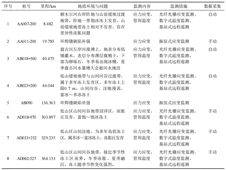 在加格達奇以北地區,針對漠大線(xiàn)6處典型凍脹、融沉災害點(diǎn),采用光纖光柵應變測量技術(shù)和一線(xiàn)總線(xiàn)數字溫度測量技術(shù),開(kāi)展了管道應力應變監測和管道周?chē)寥罍囟葓?chǎng)監測。采用振弦應變測量技術(shù)對2處環(huán)焊縫補強管段開(kāi)展了管道應力應變監測。目前投入運行的8處監測單元基本情況見(jiàn)表 1。