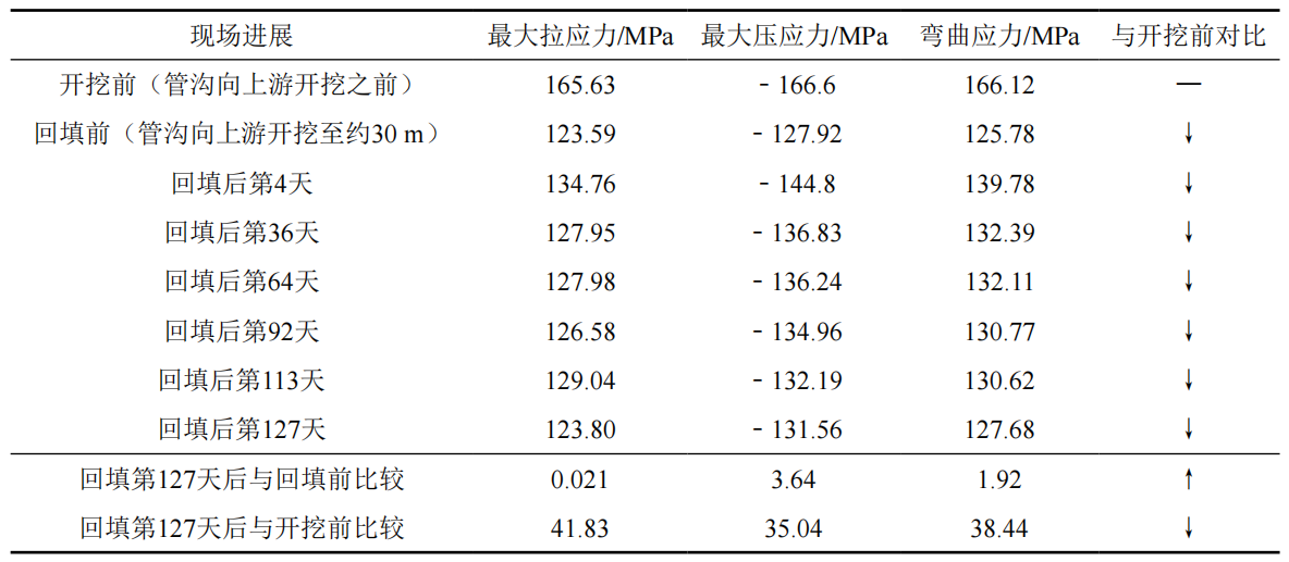 砂石路穿越段管道開(kāi)挖后,監測發(fā)現期間并無(wú)應力釋放,原因為X5上游段管道處于強凍脹、融沉土壤環(huán)境中,受砂石路約束后管道部分變形在已彎曲段形成積累,造成X3—X5應力逐年增大。盡管在設置板涵后可以消除砂石路的強約束,但對于已累積較高應力的X3—X5段管道起不到快速釋放應力的作用,遂決定管溝開(kāi)挖從X5向上游延伸30 m至X3附近,經(jīng)監測確定X4附近應力得以降低,回填管溝,結果如表 2所示。隨著(zhù)時(shí)間的推移,累積較高應力的X3—X5段管道也在設置的板涵作用下應力得到有效釋放。