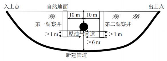 新建管道設計中心線(xiàn)方向、與在役油氣管道中心線(xiàn)交叉前、后各10 m位置處開(kāi)挖第一、第二觀(guān)察井,用以驗證定向鉆在穿越在役油氣管道前和穿越后10 m時(shí)的確切深度和位置走向,避免定向鉆在導向時(shí)鉆頭鉆到管體造成損傷甚至發(fā)生事故。觀(guān)察井開(kāi)挖深度不應小于在役管道管底1 m,平行管道方向長(cháng)度至少5 m(圖 4)。