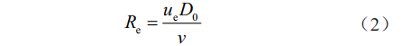 式中fs為渦流釋放頻率,Hz;St為斯托勞哈爾(Strouhal)數;Uc為流經(jīng)管道中心位置的潮流速度(假定為穩定流或恒流),m/s;Do為管道外徑,m。流動(dòng)雷諾數Re由式(2)表示: