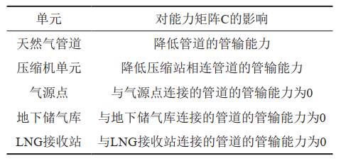 由于系統中單元的隨機失效和維修活動(dòng),會(huì )改變管網(wǎng)系統的能力矩陣C,導致系統的供氣量發(fā)生變化。管網(wǎng)系統中不同類(lèi)型單元的失效對能力矩陣C的影響如表 2所示。