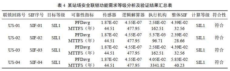 根據PFD圖、PID圖、聯(lián)鎖系統邏輯圖和SIS設置要求,分析確認SIF和硬件冗余設置,采用Markov模型計算可靠性指標,根據分析結果確定符合性并形成結論和改進(jìn)建議。某站場(chǎng)設置4項安全聯(lián)鎖功能的目標需求等級和計算等級匯總如表 4所示。