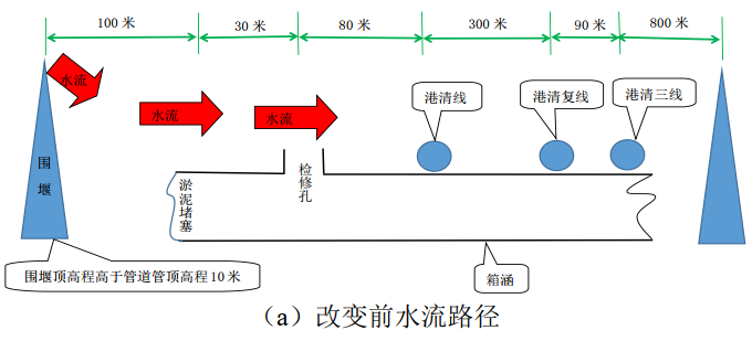 (1)連夜在來(lái)水方向修筑圍堰,疏通箱涵,使洪水改變路徑從箱涵的檢修孔出水進(jìn)入交叉施工作業(yè)坑內,防止作業(yè)坑周?chē)畨翁Ц咦鳂I(yè)坑內水的高程,降低洪水進(jìn)入作業(yè)坑的動(dòng)能。如圖 1所示。