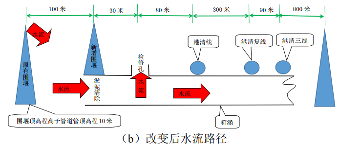 圖 1 實(shí)施控制措施前后洪水路徑對比