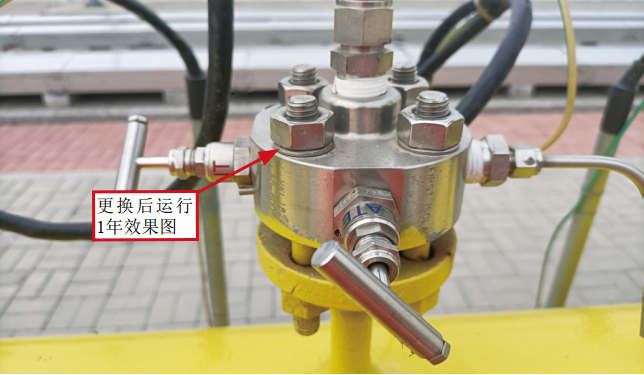 圖 2 更換不銹鋼材質(zhì)螺母墊片運行1年效果對比