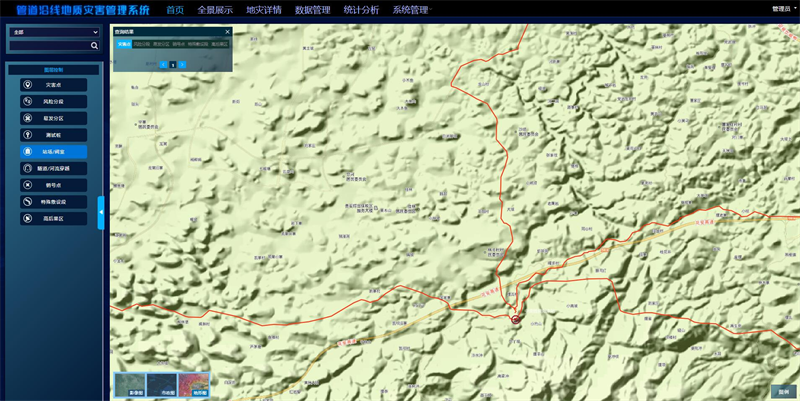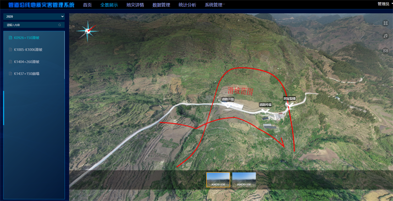 以在線(xiàn)地圖和影像服務(wù)為基礎,通過(guò)應用坐標算法轉換實(shí)現GIS空間數據及常規數據的脫密可視化展示,并提供常規的地圖操作功能。利用圖層控制及多樣的圖例實(shí)現地災點(diǎn)、風(fēng)險段、易發(fā)區、典型地質(zhì)段、高后果區、隧道河流、站場(chǎng)閥室等數據在影像圖、市政圖、地形圖多種底圖上的綜合展示及查詢(xún)。通過(guò)無(wú)人機航拍實(shí)現單一地災點(diǎn)的全景展示,清晰掌握地地質(zhì)災害的發(fā)育、規模、周邊依托、道路交通情況等。