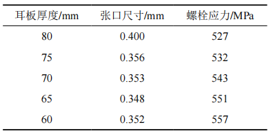 表 1 不同耳板厚度卡具張口變形尺寸與螺栓應力關(guān)系