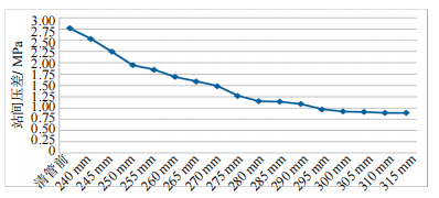 管道清管前站間壓差由投產(chǎn)時(shí)的0.90 MPa增高至2.75 MPa,理論計算結蠟厚度達40 mm,嚴重影響輸送安全和輸送效率。通過(guò)發(fā)送 17次泡沫清管器,降壓效果明顯。作業(yè)過(guò)程中沒(méi)有引起大面積的結蠟脫落,清管期間站間壓差波動(dòng)幅值控制在0.1 MPa以?xún),累計收出結蠟約1300 kg。清管作業(yè)期間管道理論結蠟厚度和壓差變化分別如圖 4和圖 5所示。