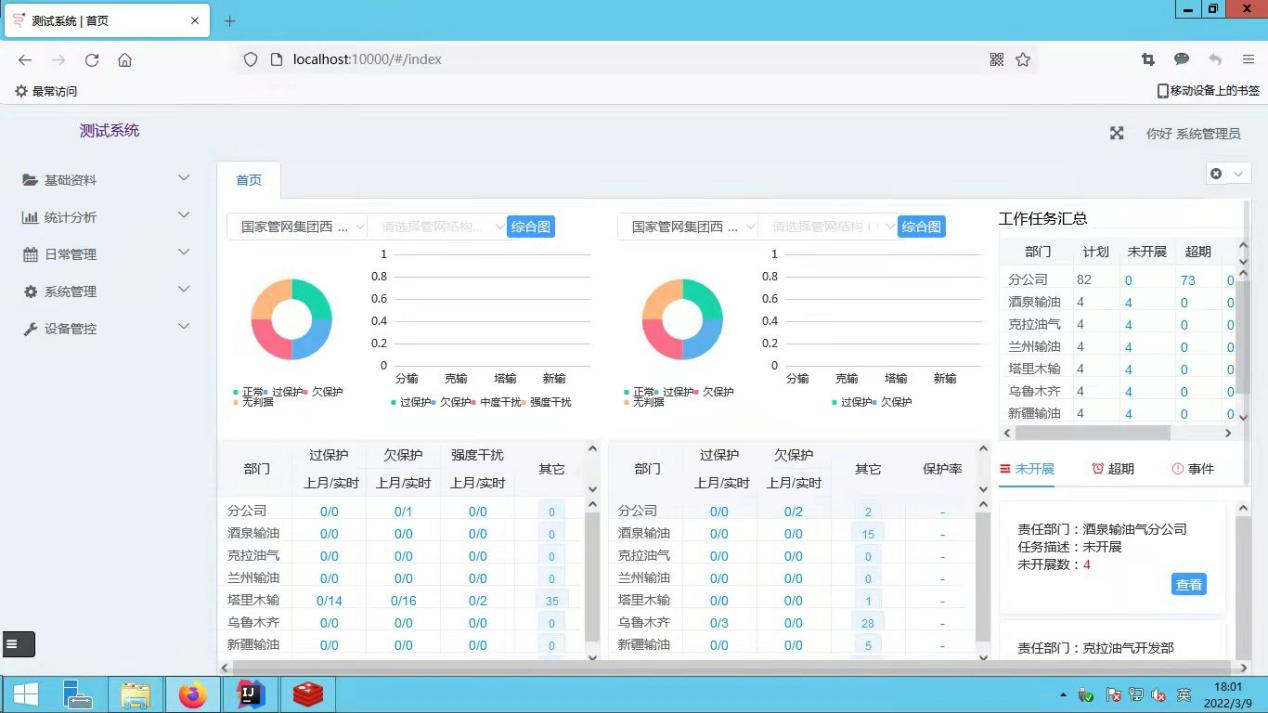 (1)平臺功能設置。陰極保護管理對象包括管道、站場(chǎng)閥室、管道防腐層及陰極保護相關(guān)設備設施。管理數據包括陰極保護系統、防腐層和相關(guān)設備設施等全部參數。平臺設置首頁(yè)(圖 1)、統計分析、日常管理、設備管控、基礎資料及系統管理六個(gè)基礎單元。