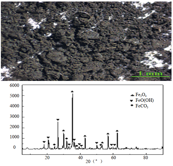 (4)磁性晶體粉末影響檢測器運行。使用體視顯微鏡(Zeiss Stemi 508)觀(guān)察黑色粉末宏觀(guān)形貌等,可見(jiàn)粉末細微,少量粉末團聚成球狀;使用X射線(xiàn)衍射儀分析其成分,主要成分為Fe3O4,FeO(OH)和FeCO3,如圖 5所示。Fe3O4為具有磁性的黑色晶體,漏磁檢測器若去掉漏磁探頭就是一個(gè)具有超強磁力的鋼刷清管器,在其運行過(guò)程中,兩側鋼刷將管道內壁金屬氧化物刷下來(lái),一部分吸附在漏磁探頭兩側的強磁鐵上,一部分堆積在檢測器前段,使得漏磁檢測器需要比正常0.2 MPa壓差更大的驅動(dòng)力。磁性氧化物粉末細微,硬度高,對皮碗的磨損嚴重。