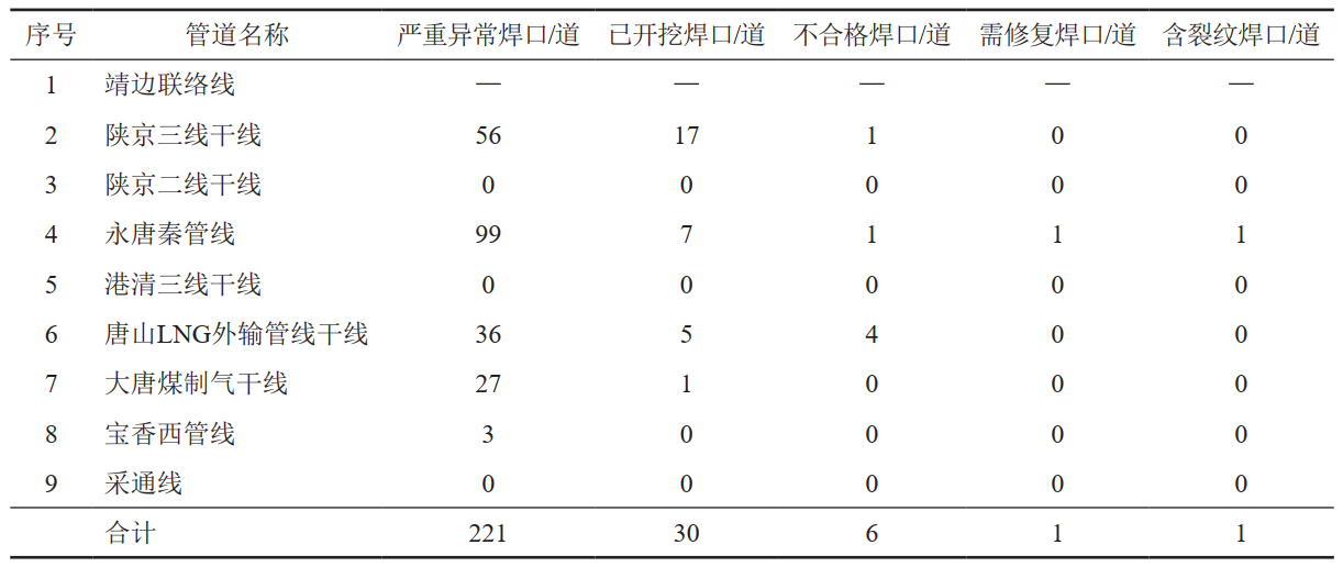 北京管道公司自2017年8月開(kāi)始對所轄陜京三線(xiàn)、永唐秦管線(xiàn)、唐山LNG外輸管線(xiàn)、大唐煤制氣干線(xiàn)、港清三線(xiàn)、寶香西管線(xiàn)、采通線(xiàn)、靖邊聯(lián)絡(luò )線(xiàn)、陜京二線(xiàn)9條管線(xiàn)共計2790多公里管道(表 1)、24.4萬(wàn)多道焊口進(jìn)行環(huán)焊縫質(zhì)量風(fēng)險排查。通過(guò)選擇性開(kāi)挖驗證,無(wú)損檢測再次檢驗,經(jīng)風(fēng)險評價(jià)對有缺陷的環(huán)焊縫采取補強或換管處理,降低管道安全隱患,為管道安全平穩運行打下堅實(shí)基礎。
