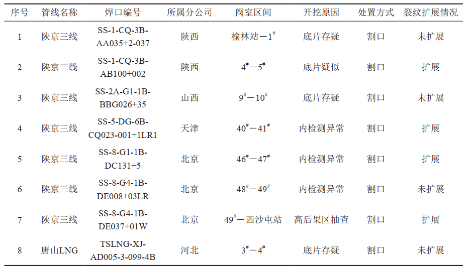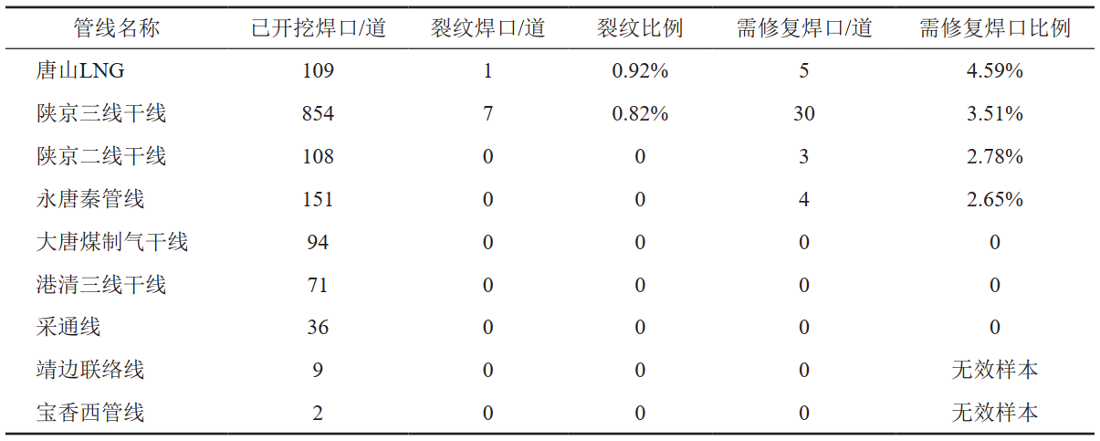 (5)焊口開(kāi)挖。截至2021年底,累計開(kāi)挖復拍焊口1434道,發(fā)現不合格焊口202道,不合格比例14.09%,需修復焊口42道,需修復比例2.93%,其中,含裂紋焊口8道,占比0.56%。焊口需修復比例及裂紋比例均低于集團公司平均統計水平。