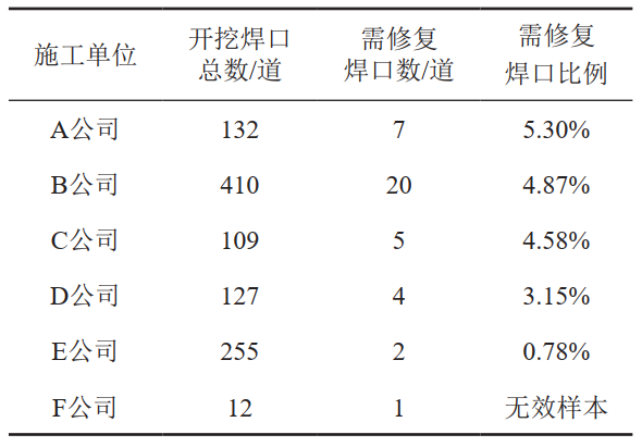 (3)按建設施工單位分析,A公司、B公司、C公司施工的焊口需修復比例最高,均占5%左右,見(jiàn)表 5。