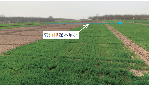 管道穿越農田、水渠、溝坎時(shí),因地形受限難以機械覆土、雨水沖刷造成覆土流失嚴重或高差較大覆土不易穩定等,導致管道埋深不能達到設計要求(圖 6),影響管道安全運行及使用壽命。管道埋深不足時(shí),一般采用鋼筋混凝土現澆或預制蓋板與素土覆蓋相結合的防護形式,蓋板尺寸一般為長(cháng)3 m、寬0.6 m,厚0.15 m,如遇管道、光纜不同溝地段,可適當加寬。采用鋼筋混凝土蓋板防護,可以防止農戶(hù)在管道上方取土或溝渠清淤,避免管道露管、管道防腐層和光纜損壞,同時(shí)也有效降低大型農機具在管道上方旋耕施工作業(yè)造成第三方損壞事故發(fā)生(圖 6)。